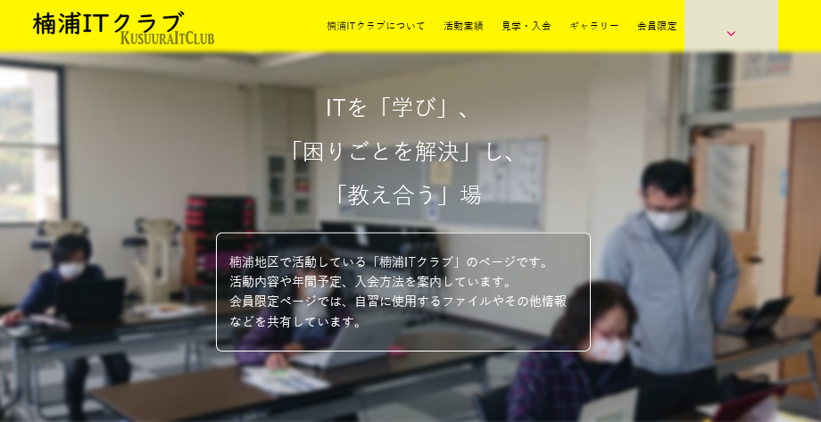 「楠浦ITクラブ」のホームページを開設しました。しかし、まだ内容は変更途中のため、仮の開設となります。「会員限定ページ」「活動実績」「入会案内」「活動予定日」など重要な項目がまだ未整備となっています。徐々に充実させていきます。2022/12/05時...